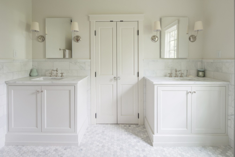 When building a Jack and Jill bathroom, you have to make special considerations for the home electrical and lighting plan. For instance, you may need lighting above both sinks. Also, you should always have a light switch next to each door.